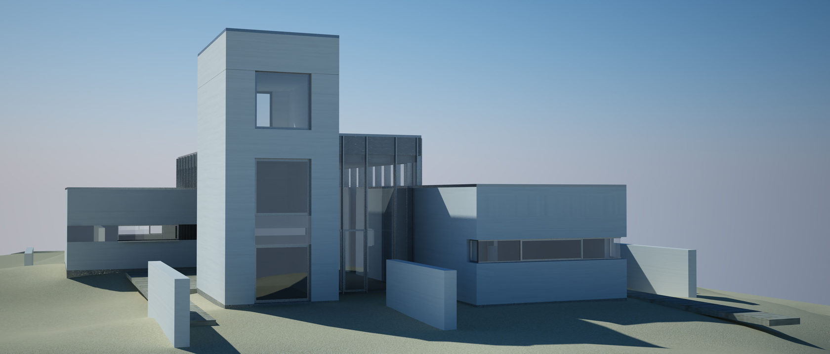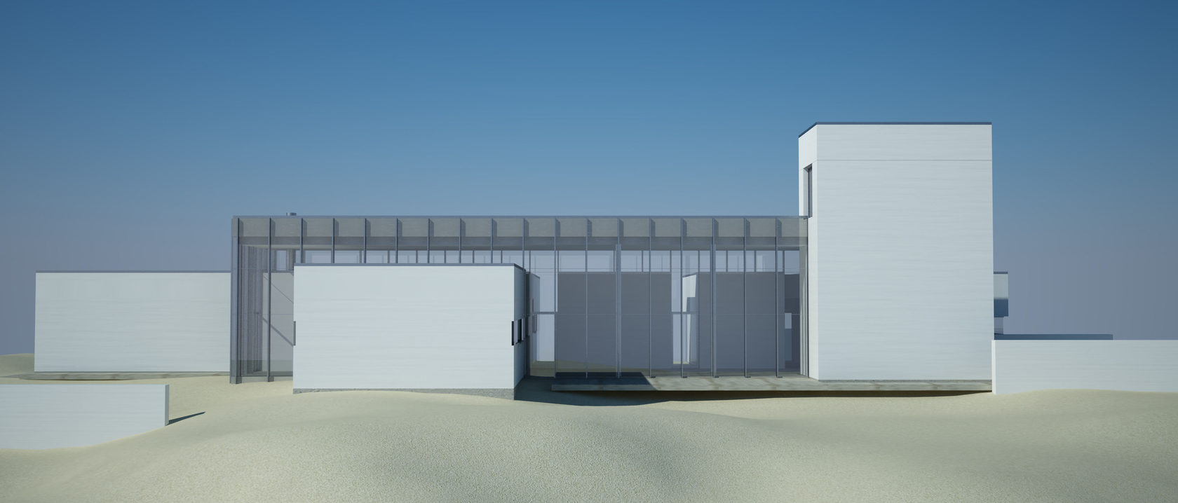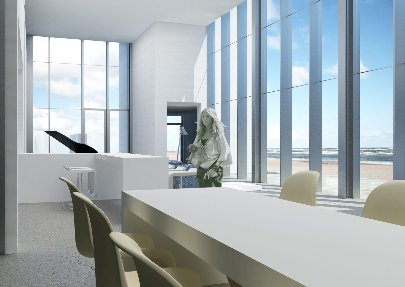 The idea of the house was inspired by the performing stage of the theater. Intimate monolithic residential blocks grouped around the glass pavilion creates a feeling of the game with volume, light and sentiontions. The house is an illusion and an obsession, it is opened and closed at the same time. The six meters height pavilion on the metal pylons gives a sense of lightness and transparency. The tower of the villa is a lighthouse with a viewing platform and terrace on the roof where the spaciousness and delight views of the sea, dunes and forest can be enjoyed.