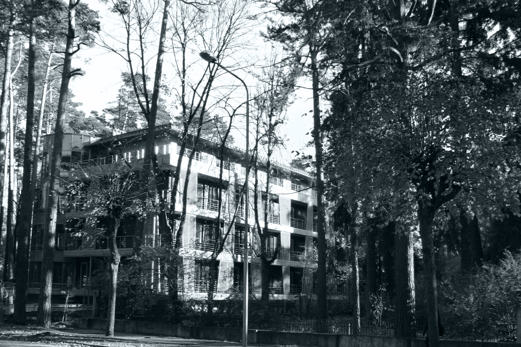 A terraced four level residential house located in Jurmala not far from the Gulf of Riga. The facade panels from the dark wood in combination with the simple concrete merge with surrounded pine trees. This building is very carefully integrated in the natural context and almost disappears in it.