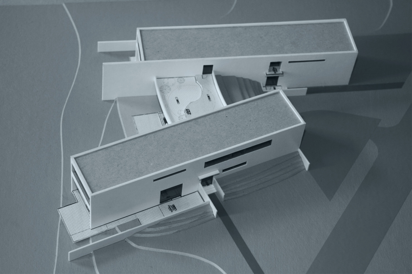 The house was designed for two friends. Two spaces connected by one idea - to be together and enjoy life. Two independent narrow volumes are united by a common space for outdoor activities. The proportions of each house are determined by the idea of a sufficient view to the lake, the same reason the houses are slightly shifted relative to each other. The main observation platform with a view of the lake and everything rests under it - sauna, a small swimming pool and gym.