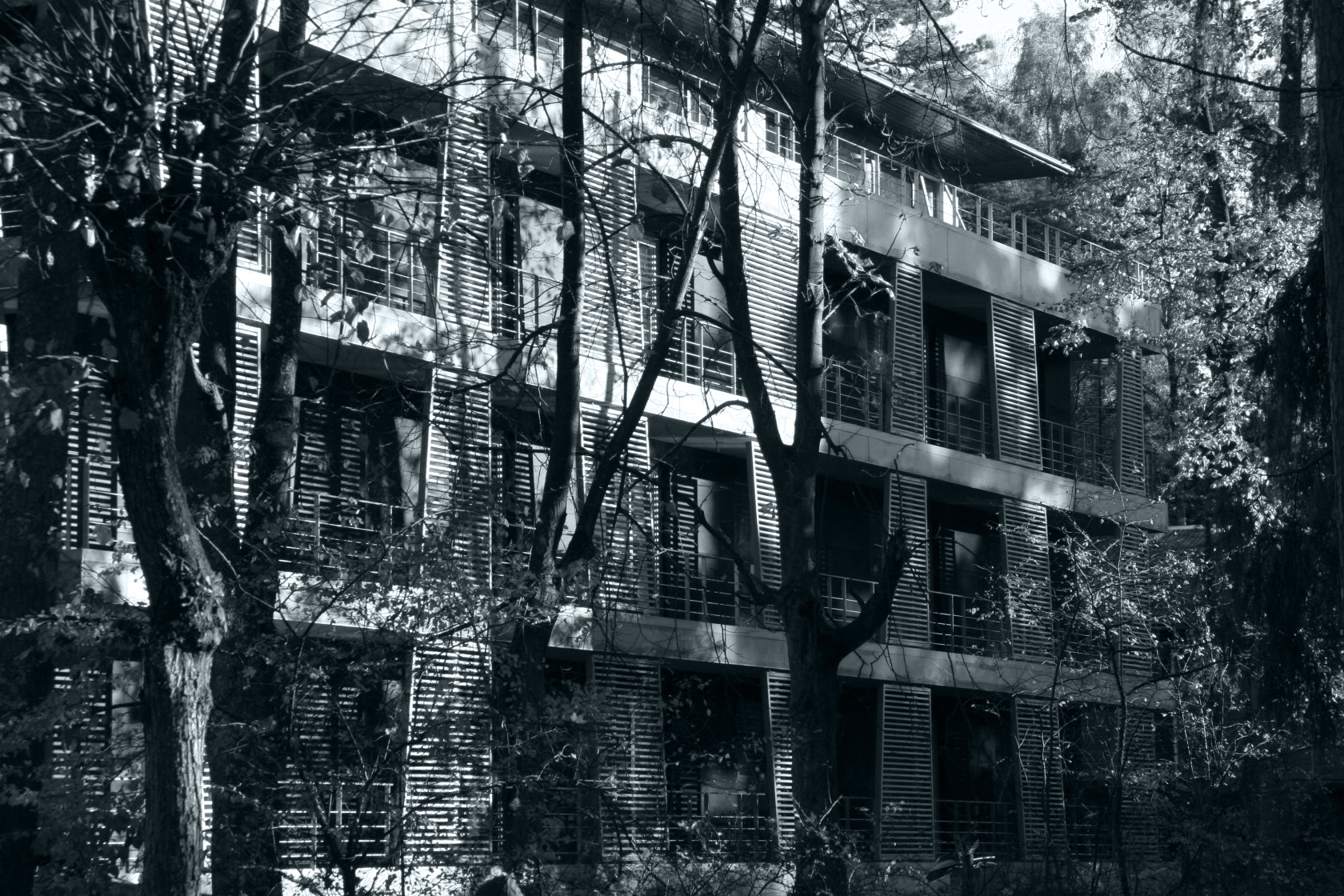 A small terraced four level residence house located in Jurmala, Bulduri. The facade panels from the dark wood in combination with the simple concrete merge with surrounded trees. This building is very carefully integrated in the natural context and almost disappears.
