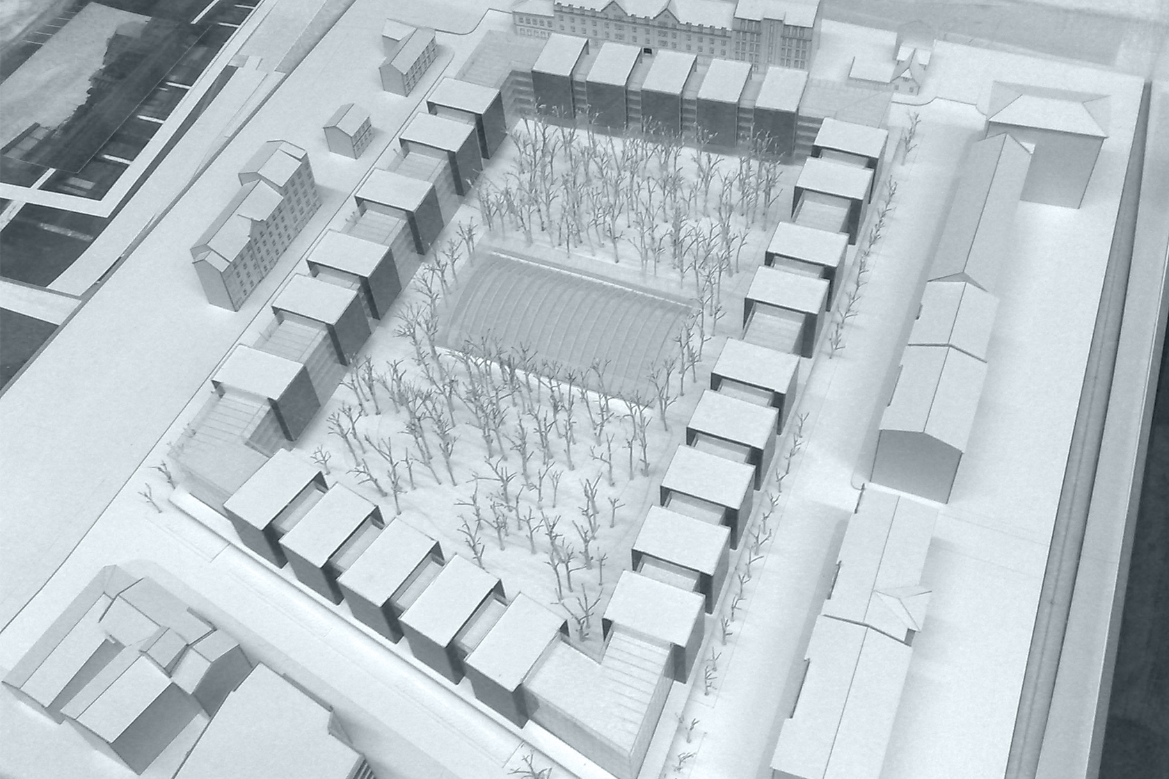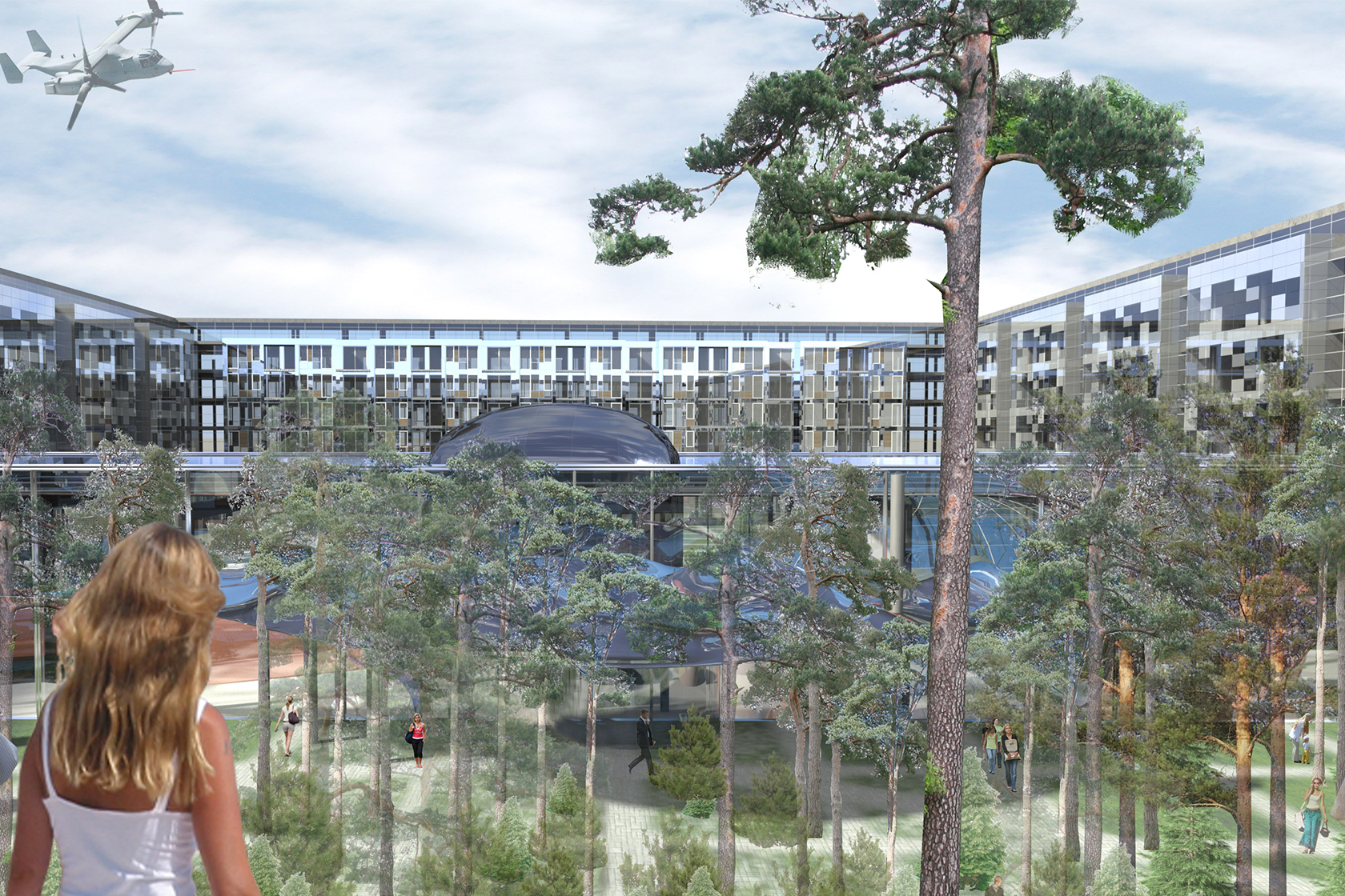 A concept of the 80,000 sqm multifunctional complex in Riga became the vision to rethink the formation of the urban environment and the people placed in it. An unusual idea of the city development project from concrete and glass with pine forest within it. Contrast between the outside modern city look and nature inside with pine forest, the smell of the tar, singing birds and squirrels, water and grass.