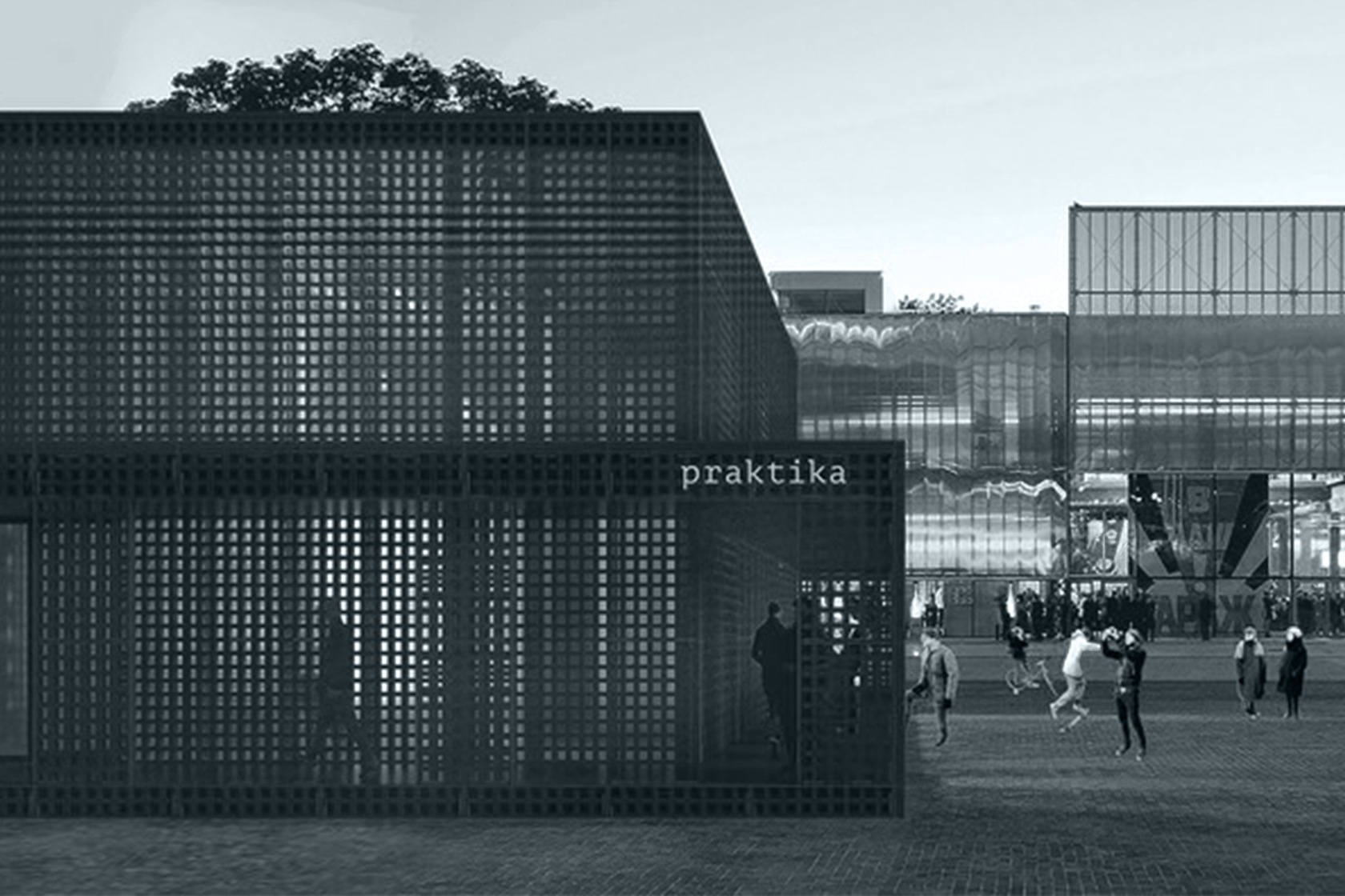 The Praktika Theater required a large scale - from here came the idea of a mobile stage, which expanded the theater's presence, but at the same time preserved its style and chamber atmosphere. Mobile theater is assembled from a building formwork. The design can be transferred from one place to another. The perimeter form allows the object to unfold from four sides, both inside and outside.