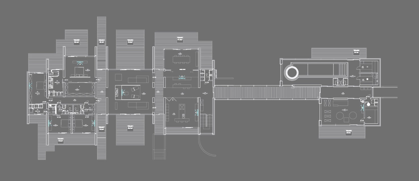 Two parts of the complex, the main residential building and the spa block with a swimming pool, is one level building placed on the two dunes and connected by the glazed passage. Technical and subsidiary rooms are located in the basement of the building. Building foundations are constructed very specifically and take into account that there can be strong vibrations and shifts of the dunes during the large storm. Several parts of the building, the main living block, passage and the spa area are connected with movable construction joints. It will extinguish tension that can appear during the specific weather conditions when a strong wind and wave strikes on the dune.